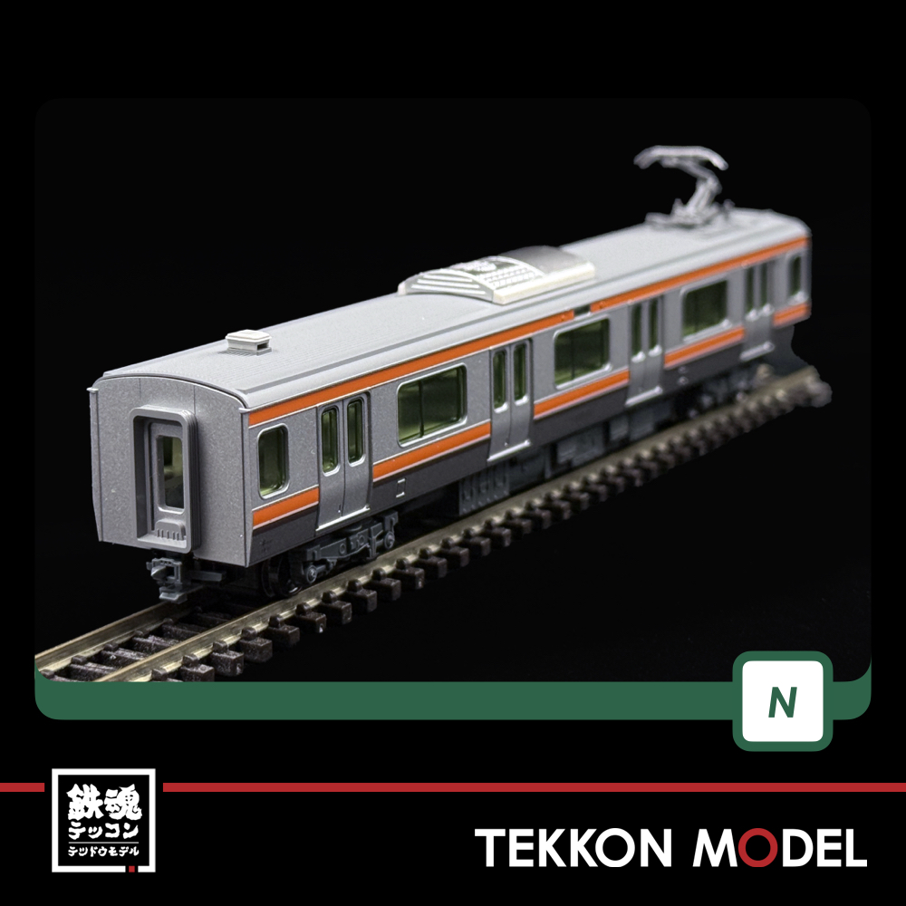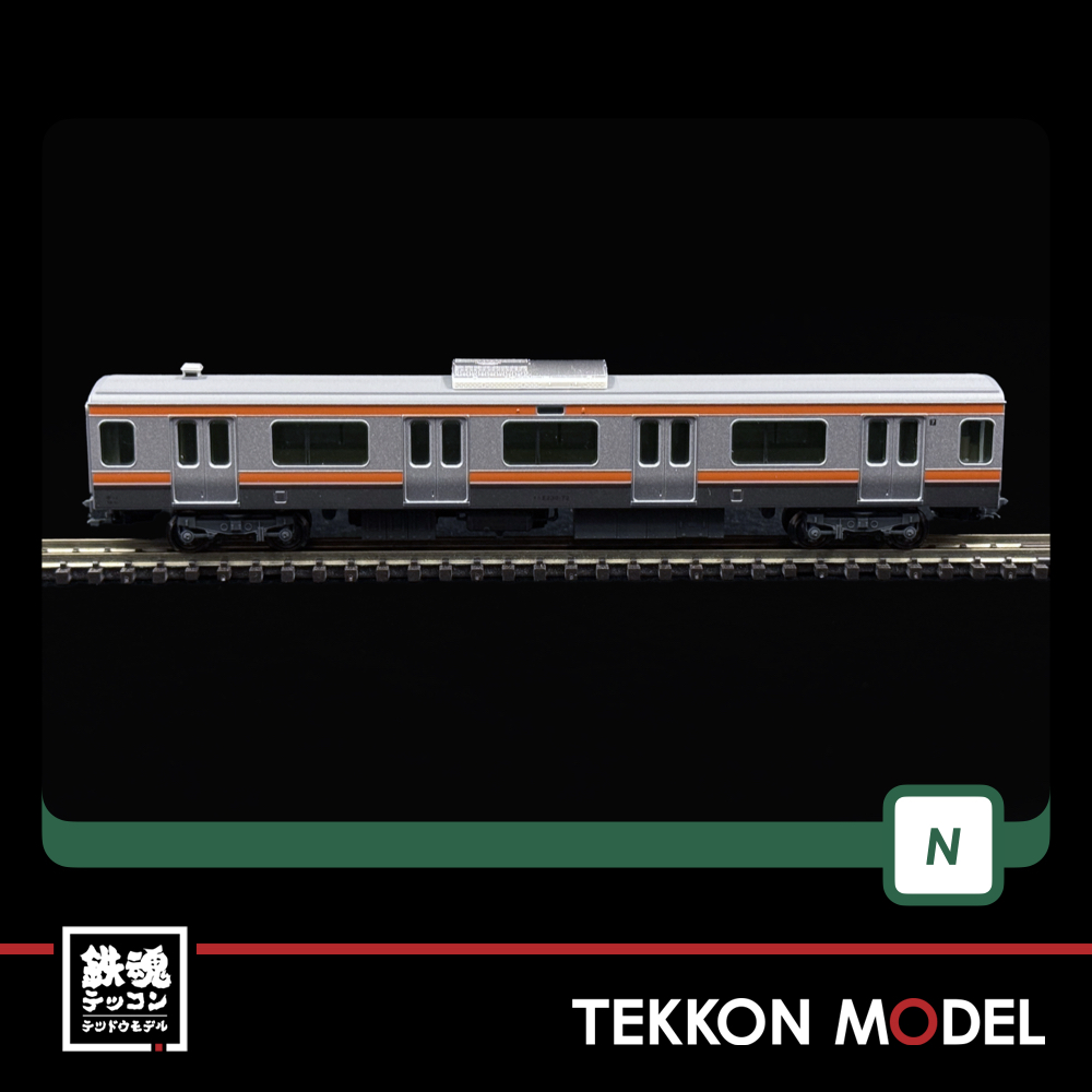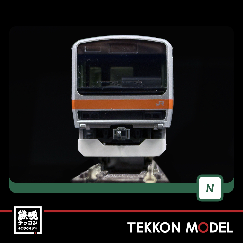 ②209系500番台と異なる銀色の前面、前面のJRマーク位置が帯の上辺に寄った外観を再現