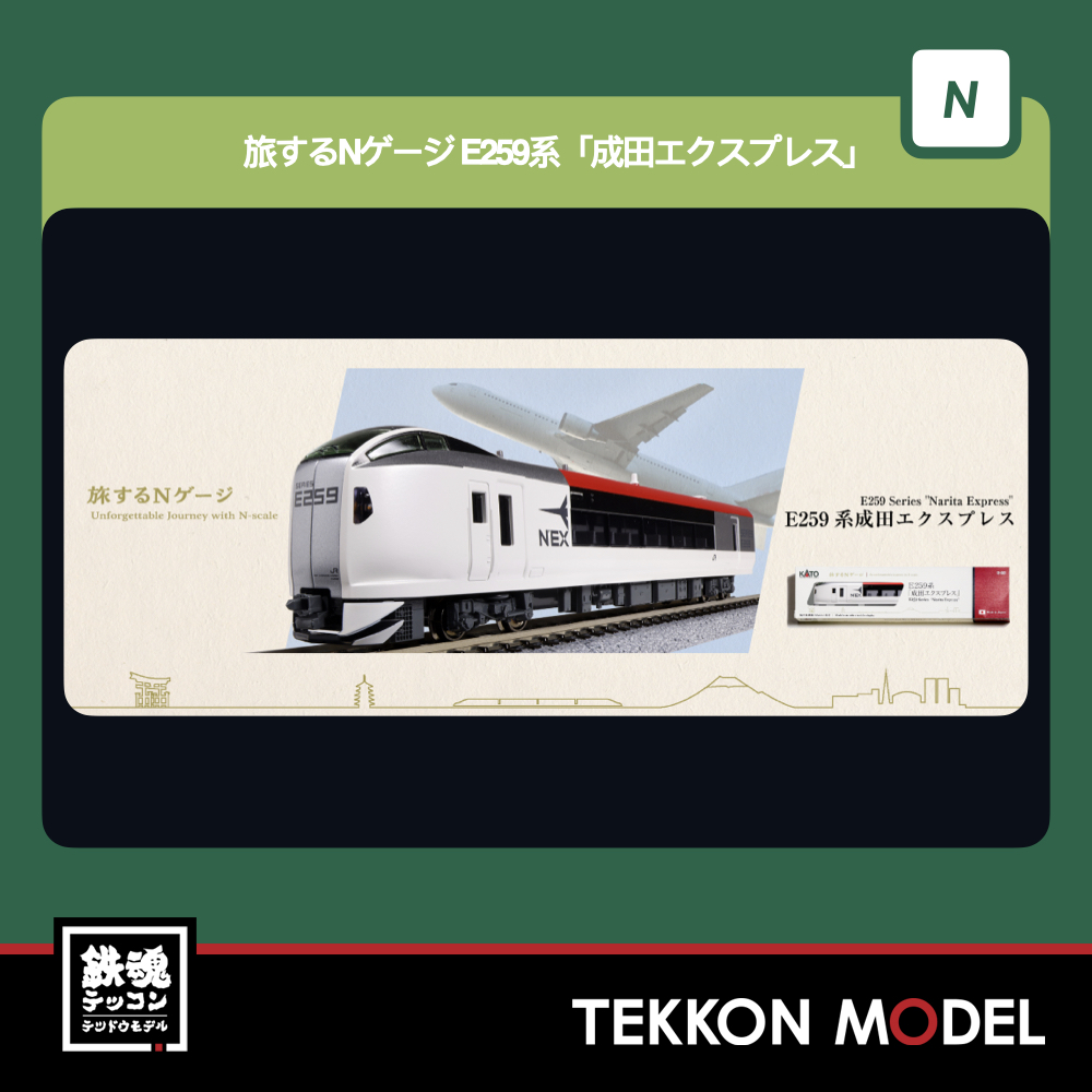 ◆首都圏と成田空港を結ぶ特急「成田エクスプレス」として活躍するE259系が<旅するNゲージ>で再登場です。令和6年(2024)より総武本線の特急「しおさい」での運用を開始し、それに伴い先頭車側面の航空機をあしらったロゴと「N’EX」ロゴが撤去された外観を再現いたします。外国人観光客には日本観光の記念品として、また国内のユーザー様にもお気軽に手に取っていただける製品としてオススメです。