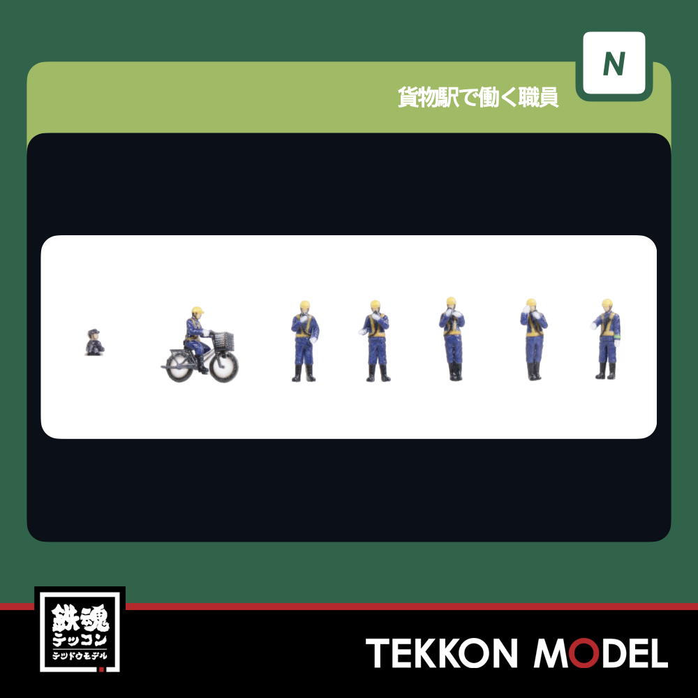 ②上下とも濃紺の冬服に反射ベスト・黄色ヘルメットを着用して無線機を持つ貨物駅職員をモデルに製品化