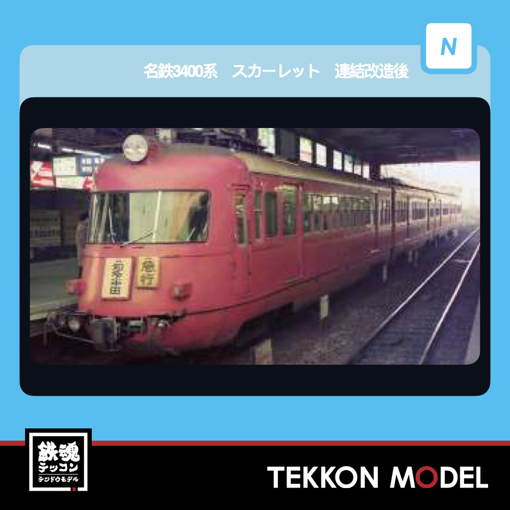 MICROACE A1057 愛知電気鉄道と名岐鉄道の合併により誕生した名古屋鉄道では、1937年に初の新型車として3400系を東部線(神宮前ー豊橋)向けに投入しました。当時流行していた流線形のデザイン、前面下部から側面床下機器全体を覆うスカート、濃淡グリーンの塗装などが特徴で、ファンからは「いもむし」と呼ばれ親しまれました。2両編成で製造されましたが1950年と1953年に中間車が増備され最終的に4両編成になり引き続き名古屋本線で活躍しました。1967年には重整備(更新工事)が行われ、前面窓の連続窓風曲面ガラス化、側面窓枠のアルミ化などが行われました。車体塗色は何度か変更されており、「濃淡グリーン」(1937年~)→「キャンディピンクとマルーンのツートン」(1953年頃~)→「ストロークリームにスカーレットの帯」(1968年頃~)→「スカーレット単色」(1976年頃~)となりました。1984年には連結化改造が行われ、AL車(3900系・7300系等)と併結できるようになり、前面スカートにジャンパ栓などが追加されました。1988年、後継車に置き換えられ(初代)3401編成は廃車となりました。