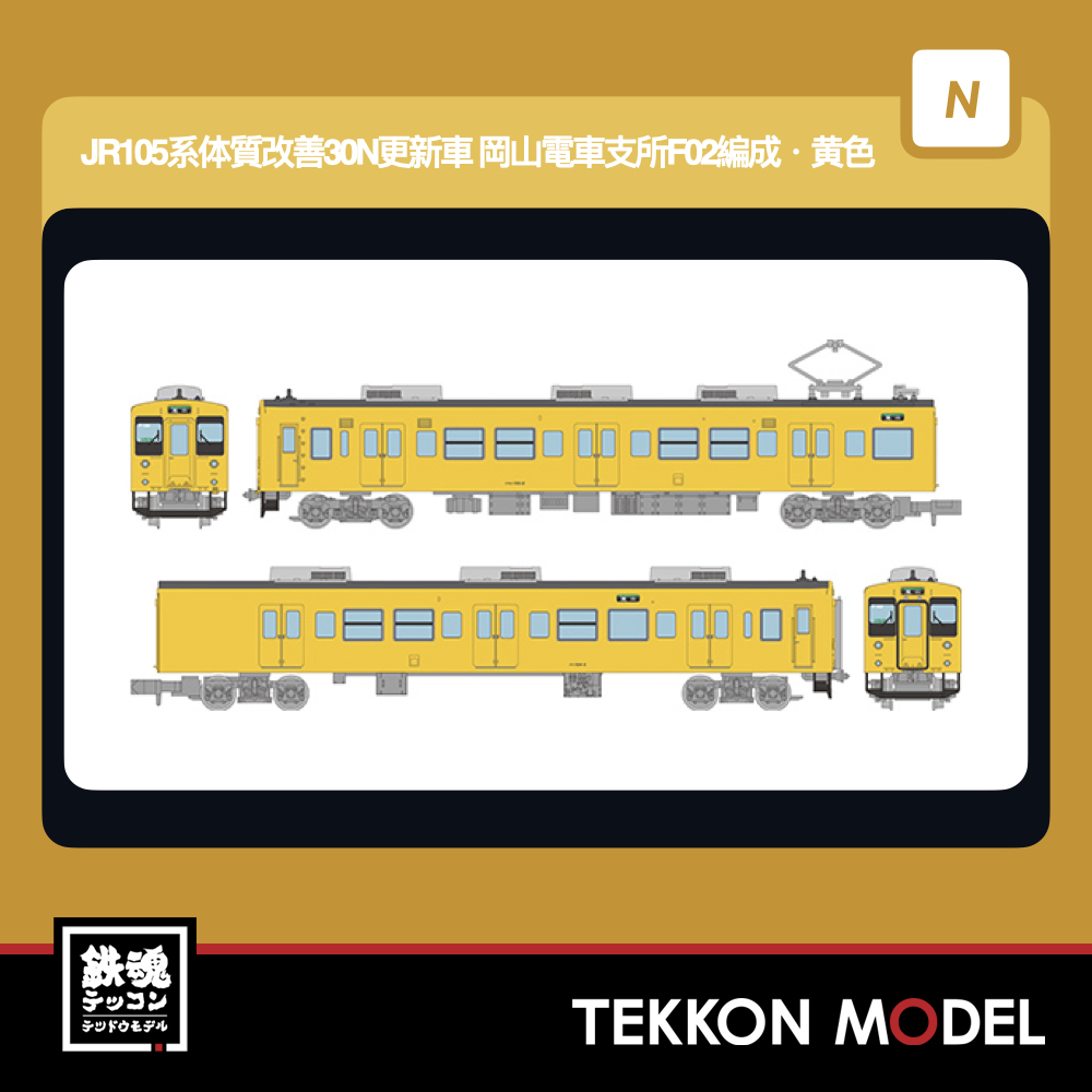 105系電車は地方の電化路線で使用されてきた旧型車両を置き換えるために登場しました。新規製造されたグループは、乗降扉が3扉の仕様となっています。下関総合車両所岡山電車支所の105系は、7編成14両が在籍しており、主に福塩線・山陽本線で運用されています。本製品では、ボディーカラーが黄色一色に変更され、床下機器がグレーに塗装された近年の姿を再現します。