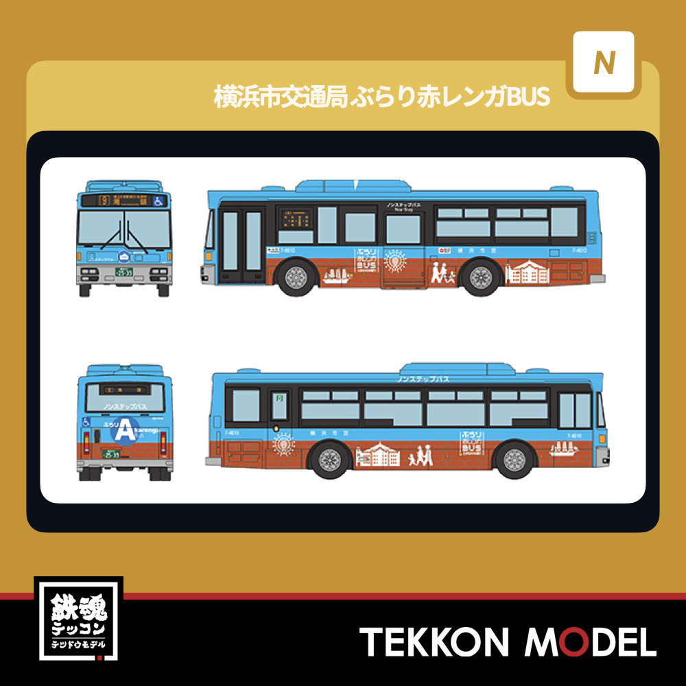 横浜市交通局では、2016年10月1日、横浜の観光スポットをより便利に、より快適に、より分かりやすく散策いただけるよう、「ぶらり三溪園BUS」「ぶらり赤レンガBUS」 「ぶらり野毛山動物園BUS」のぶらり観光SAN路線3路線の運行を開始しました。 各路線とも行き先がひと目で分かるラッピングバスで運行していましたが、そのうち「ぶらり赤レンガBUS」は2020年のベイサイドブルー開業に伴い、運行終了となりました。その後、一部デザインを残しつつ通常の路線バスとして使用されていましたが、先般、ラッピングを解除され廃車となりました。今回、思い出のデザインとして、横浜を代表する観光名所を結んだ「ぶらり赤レンガBUS」を製品化致します。是非ご期待下さい。